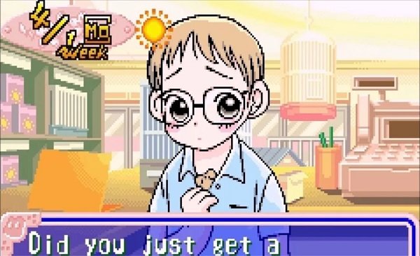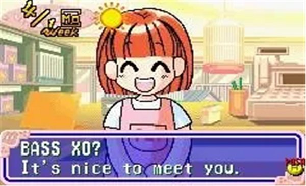 2、看左上角显示4月第一周,跟红发女孩对话,点蓝色对话框继续剧情。